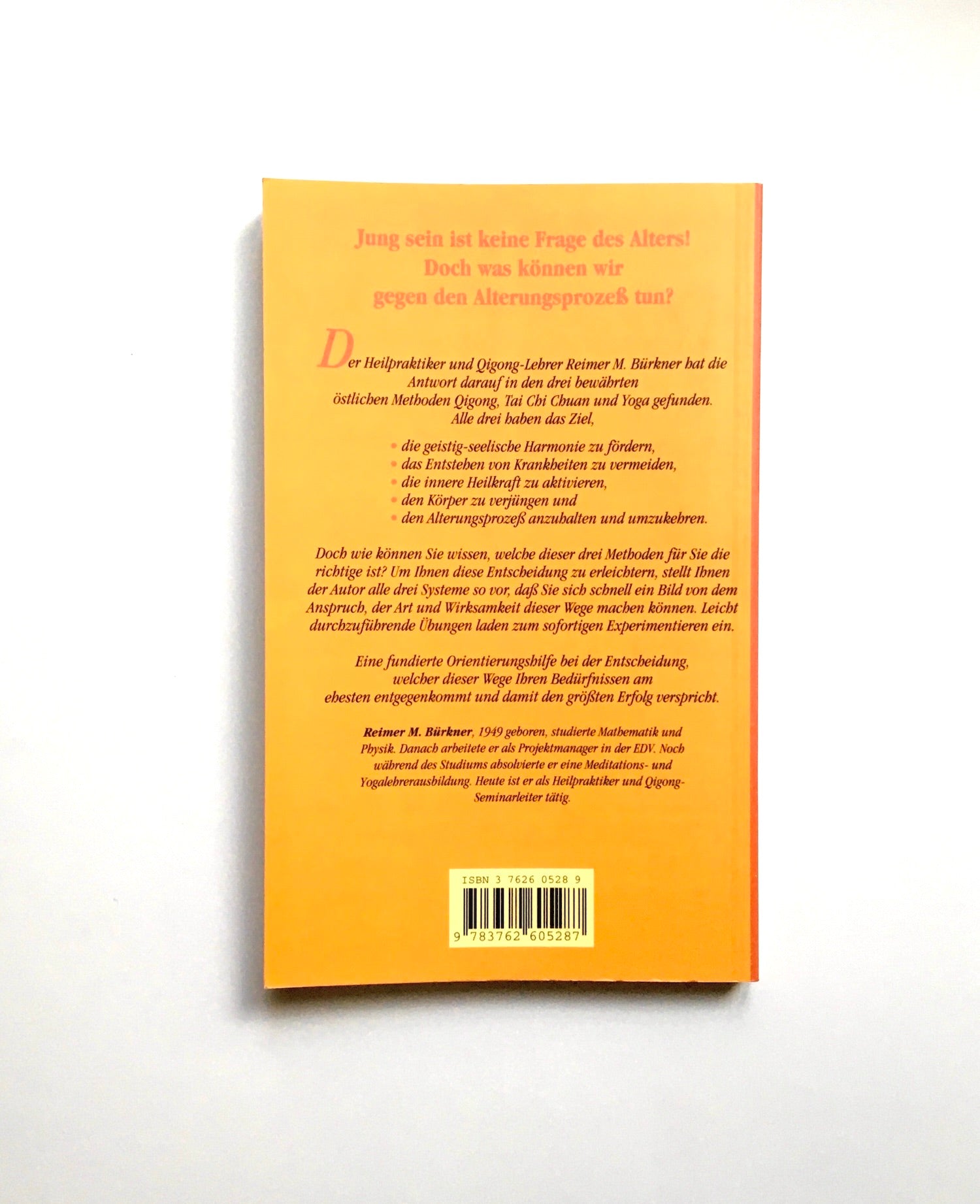 Die Suche nach wirksamen Verjüngungsmethoden ist so alt wie die Menschheit! Doch was kann der einzelne gegen den Alterungsprozeß tun? Der Heilpraktiker und Qigong-Lehrer Reimer Bürkner sucht die Antwort auf diese Frage nicht in den bisher vergeblichen Bemühungen der westlichen Wissenschaft, sondern in den drei bewährten östlichen Methoden Qigong, Tai Chi Chuan und Yoga. Alle drei Methoden haben das Ziel, die geistig-seelische Harmonie zu fördern, das Entstehen von Krankheiten zu vermeiden, die innere Heilkraft zu aktivieren und den Körper zu verjüngen, den Alterungsprozeß anzuhalten und umzukehren. Dieses Buch stellt die drei Methoden ausführlich vor, so daß sich der Leser ein Bild machen kann und die für ihn nützlichste Methode herausfindet.