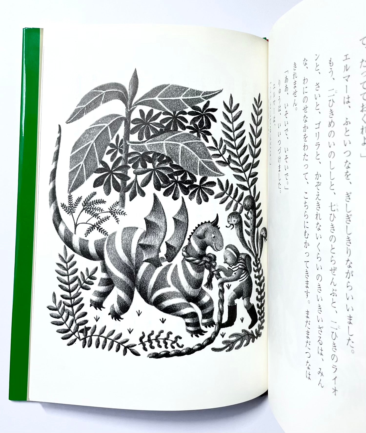 年取ったのらねこからどうぶつ島に囚われているりゅうの子どもの話を聞いたエルマーは、りゅうの子どもを助ける冒険の旅に出発します。どうぶつ島ではライオン、トラ、サイなど恐ろしい動物たちが待ちうけていました。エルマーは、知恵と勇気で出発前にリュックにつめた輪ゴムやチューインガム、歯ブラシをつかって、次々と動物たちをやりこめていきます。エルマーはりゅうの子どもを助け出すことができるのでしょうか?