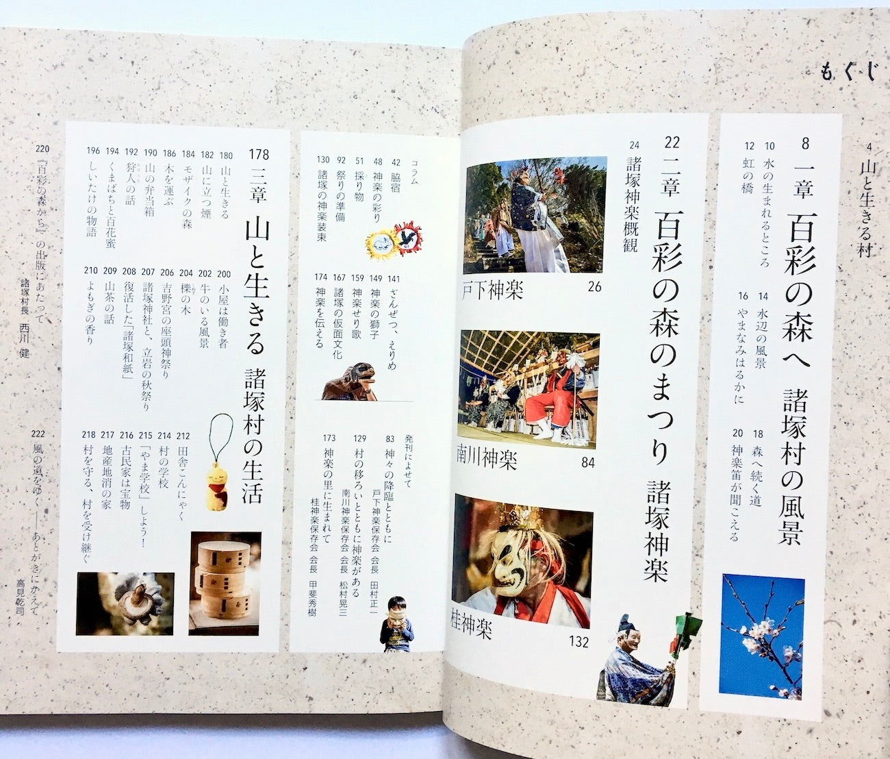森の神々が、今ここに立ち現れる――「百彩の森」と呼ばれる多様な林相の山に逞しく生きてきた諸塚村の人びと。平地は村土の1パーセントしかなくまさに山の村。そんな村で彼らが伝えてきた「戸下神楽」「南川神楽」「桂神楽」の3つの諸塚神楽を中心に、風景、風土、暮らしを記す。
