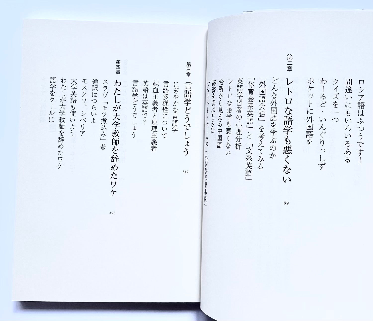 世界に通用するために外国語を勉強しなければ!そんな気持ちを脱力させて、言葉本来の面白さを感じ取りたい。古本屋で知らない外国語のテキストを買ってみたり、時には現地にいってみたりとあちこち思考をめぐらした結果がこのエッセイに詰まっている。しかも、外国語をもっと楽しく勉強したい人へ向けたアドバイスとして読める。文庫化に際して未収録作品多数!
