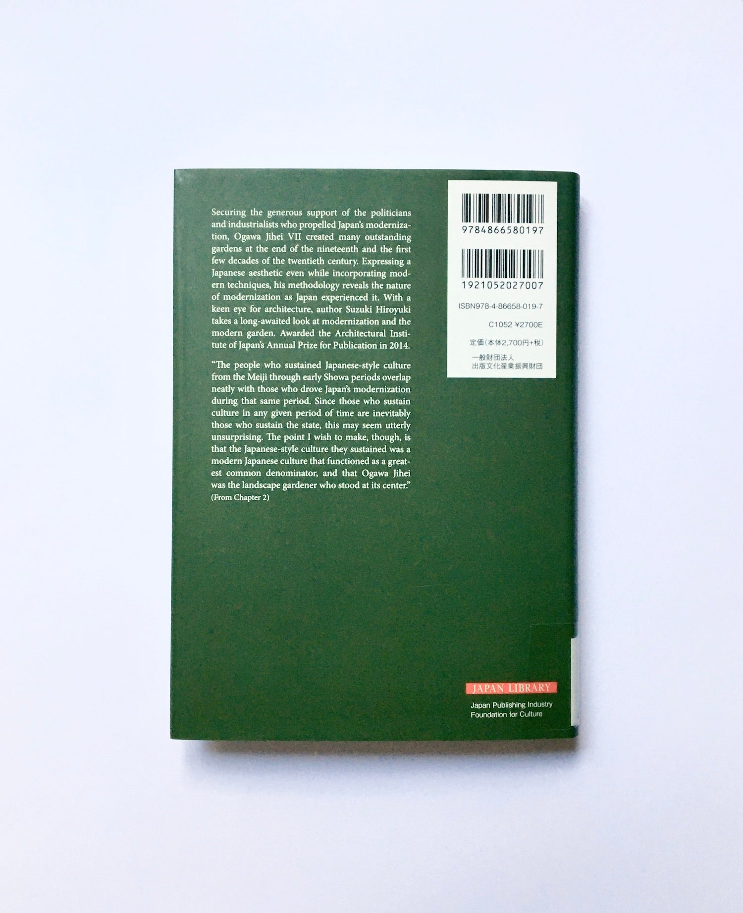 Securing the generous support of the politicians and industrialists who propelled Japan’s modernization, Ogawa Jihei VII created many outstanding gardens at the end of the nineteenth and the first few decades of the twentieth century. Expressing a Japanese aesthetic even while incorporating modern techniques, his methodology reveals the nature of modernization as Japan experienced it. With a keen eye for architecture, author Suzuki Hiroyuki takes a long-awaited look at modernization and the modern garden. Awarded the Architectural Institute of Japan’s Annual Prize for Publication in 2014.