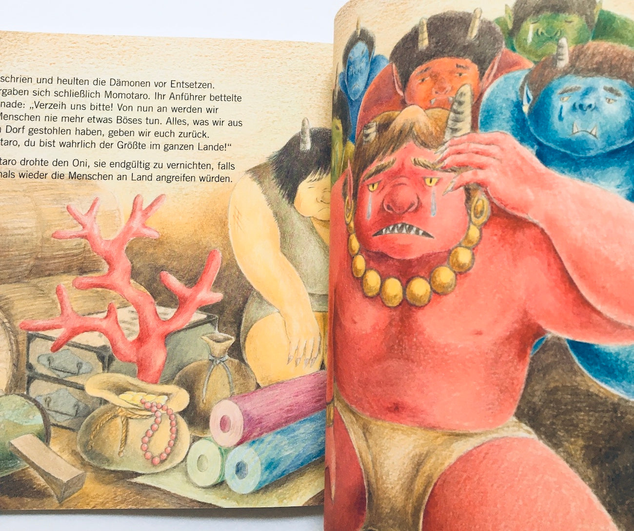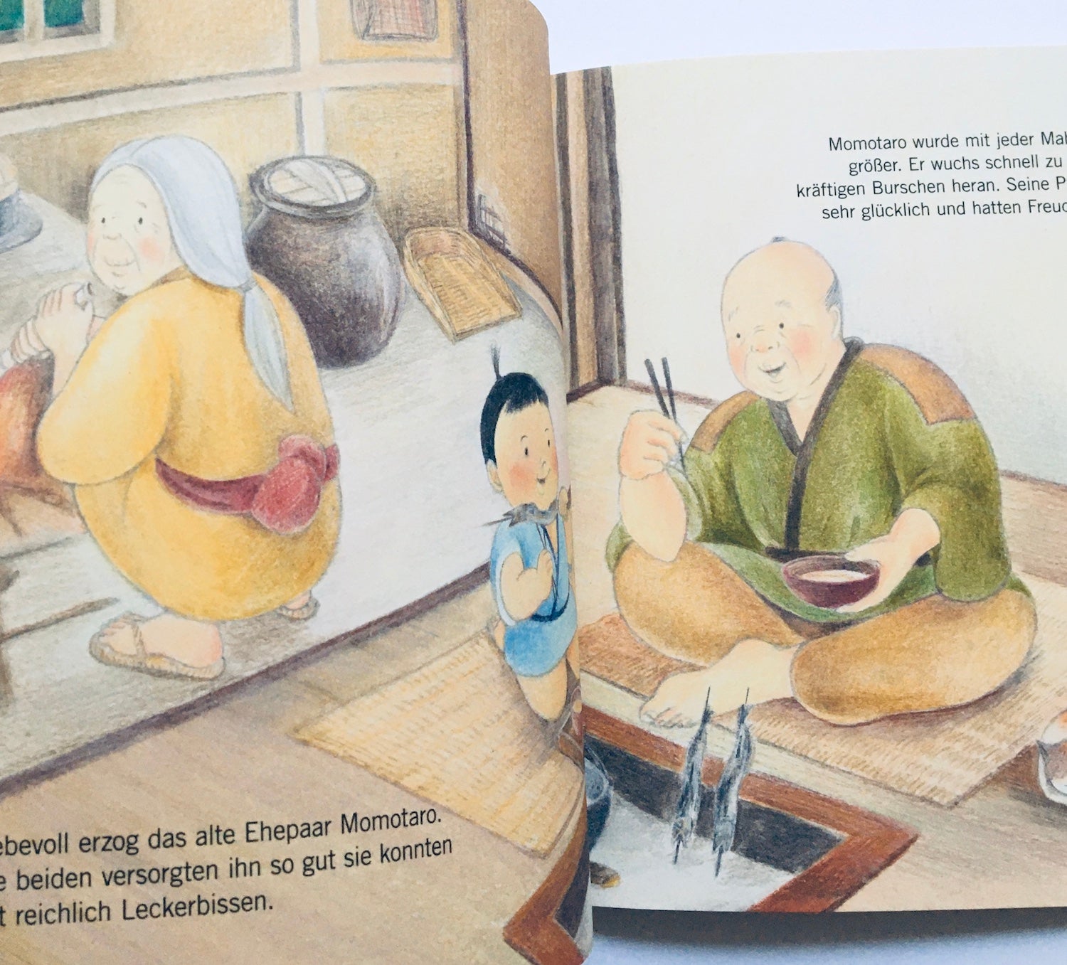 Momotaro, der rätselhafte Junge aus dem Pfirsich, wächst und gedeiht durch die Liebe eines alten Ehepaares in einem kleinen Häuschen auf dem Lande. Als er auszieht, mit Hund, Affe und Fasan das Dorf vor dem Angriff böser Dämonen zu schützen, beginnt eine abenteuerliche Fahrt. Mit der Geschichte Momotaros erscheint hier eines der beliebtesten japanischen Volksmärchen um einen starken Jungen und seine tierischen Freunde als Bilderbuch. Es läd mit der Origami-Faltanleitung auf dem Back-Cover dazu ein, Momotaros Pfirsich selbst in traditionell japanischer Weise zu falten. Dieses aus Japan stammende Märchen enthält Motive, die durchaus an europäische Märchen erinnern. Wer liebt nicht die Bremer Stadtmusikanten, das tapfere Schneiderlein, den Däumeling und den starken Wanja? Sie alle haben nun einen japanischen Freund in Momotaro. Jetzt in einer handlichen Softcoverausgabe mit Origami-Faltanleitung des Pfirsichs erhältlich!